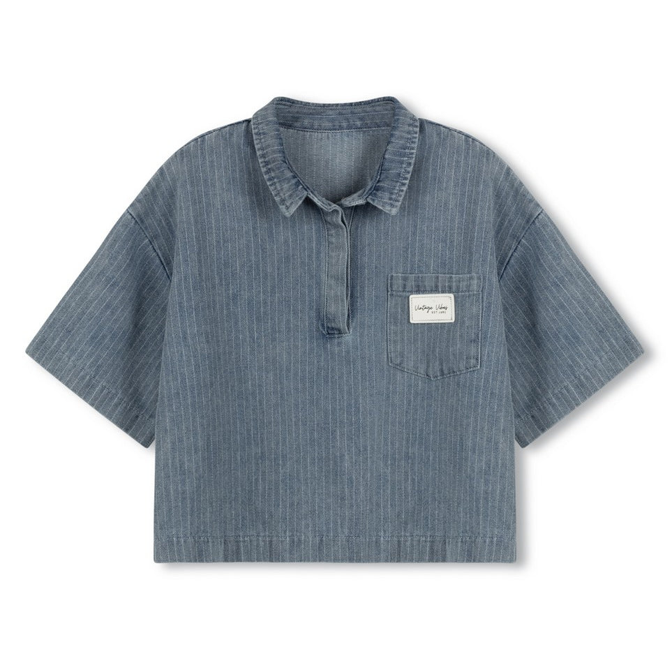 Vibe Blue Pinstriped Butterfly Logo Blouse